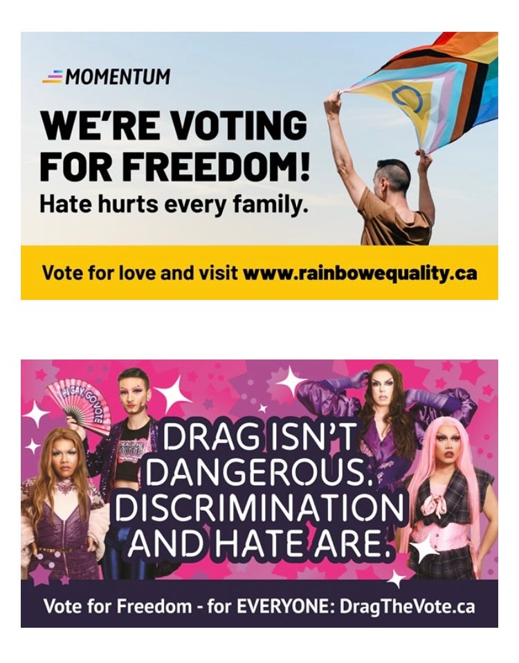 Last month I got an email asking if we’d chip in a little extra. They had designed a series of beautiful billboards about voting for love and freedom, and they were hoping to raise enough to put two billboards in twelve Canadian cities. Anyone who donated would get to choose which city to support, and that started a fun game in our house called who’s-the-most-backwards! We were happy to support this project and thrilled to find out ten days later that they’d raised enough. Fun fact: The billboards feature drag artists from the local communities.