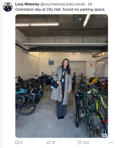 Lucy Maloney was new to running for office but not new to advocating for all the things that are important to us. She had years of community experience speaking up for renters, cyclists and safe streets around schools, and she’s an environmental lawyer. She was running with a party that’s all about climate justice, a sustainable economy, childcare, affordability and equity. (We have parties at the city level — weird, I know.)